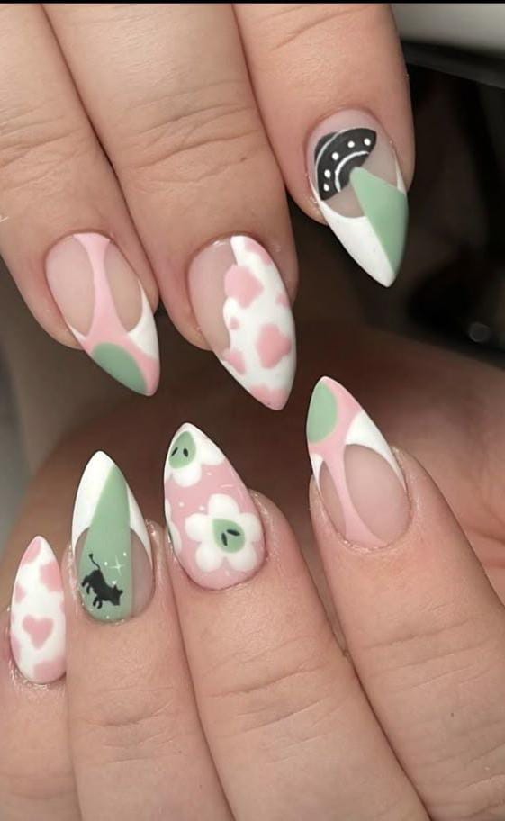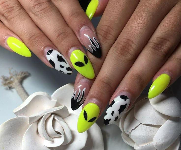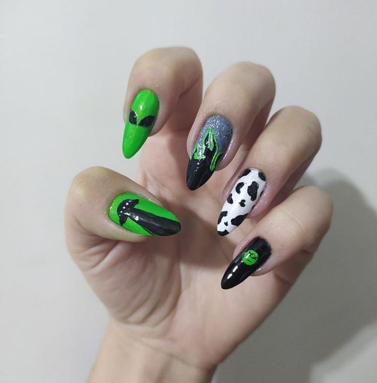 A mix of green, black, silver, and cow print nails with alien faces and UFO art, giving a playful cosmic theme.
