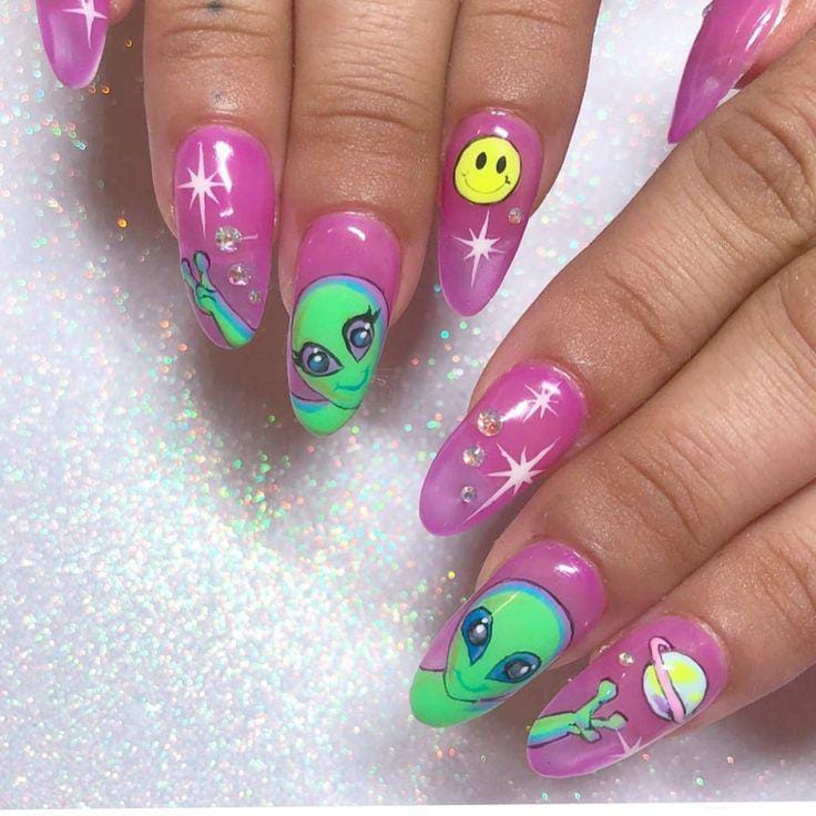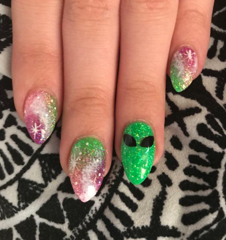 A glittery mix of pink, green, and white with starbursts, featuring one bold green alien face nail for a space-inspired pop.