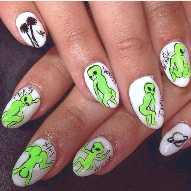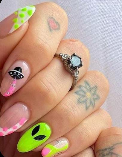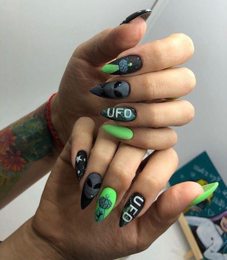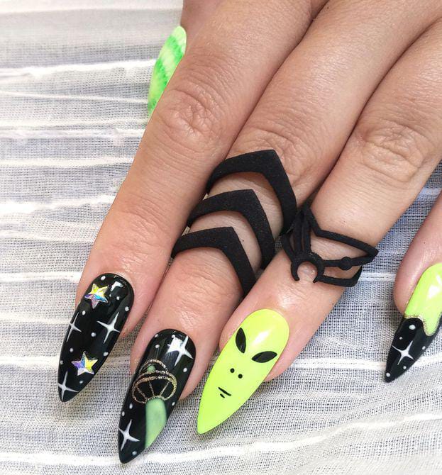 A mix of neon green and black nails with alien faces, UFOs, and cosmic stars, giving a bold outer-space vibe.