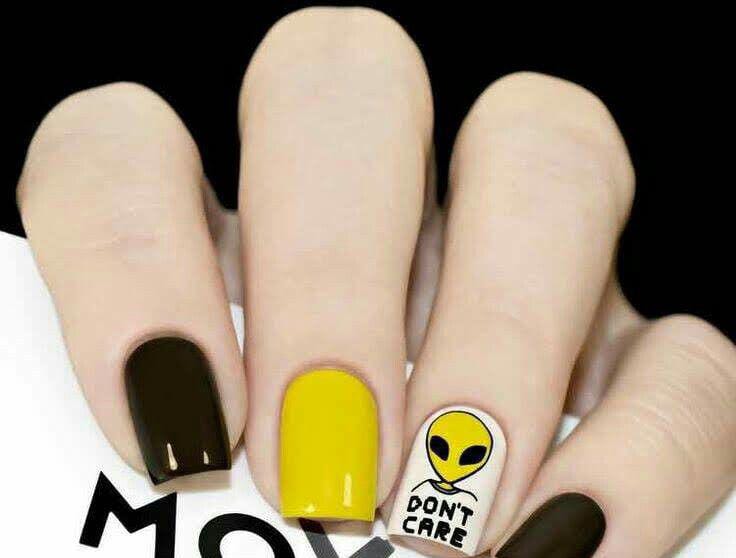 Black and yellow nails with a clean design, highlighted by a yellow alien face and “don’t care” slogan for an edgy, statement look.