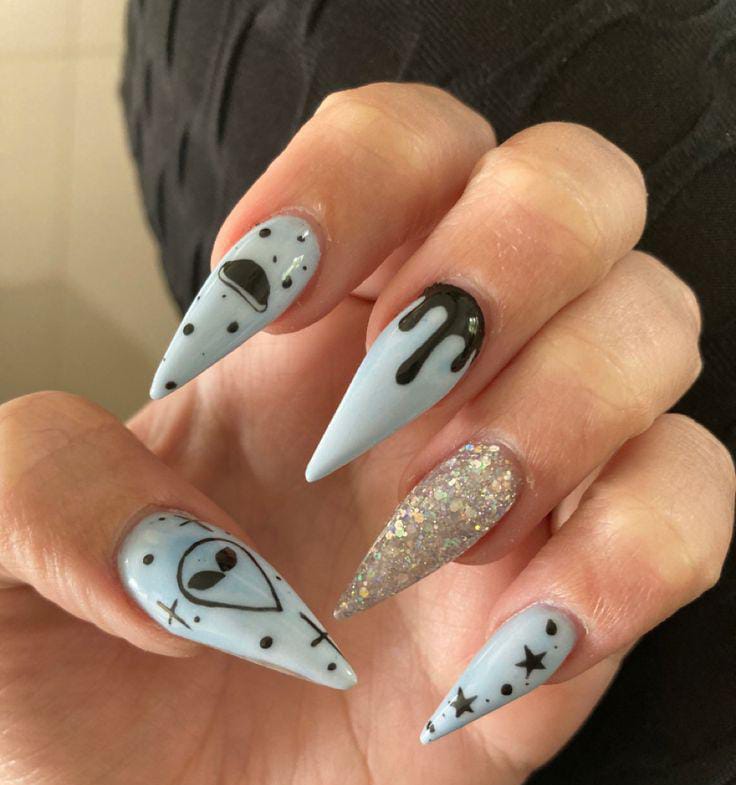 Pointed nails with pastel blue, black space symbols, dripping designs, and alien accents mixed with a glittery nail for a cosmic, artsy vibe.