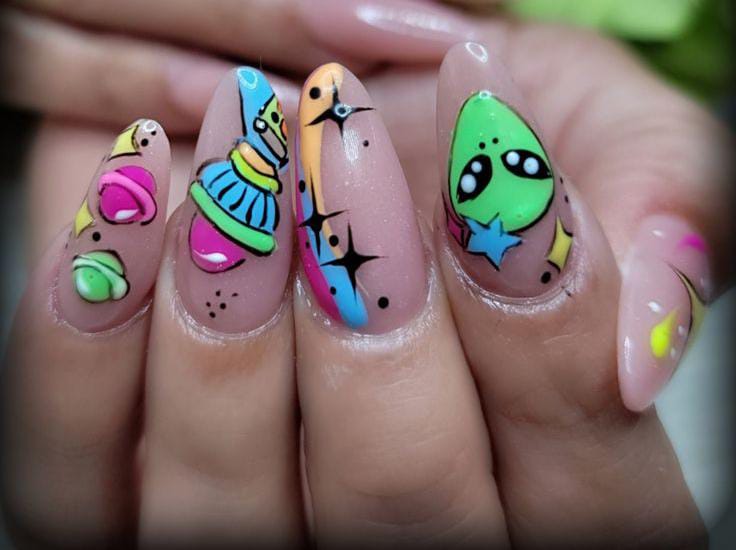 Bright neon planets, spaceships, and a green alien face with bold, playful colors on a nude base.
