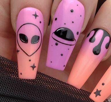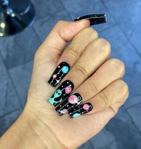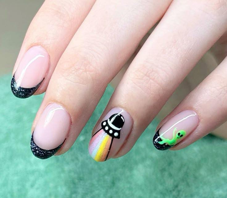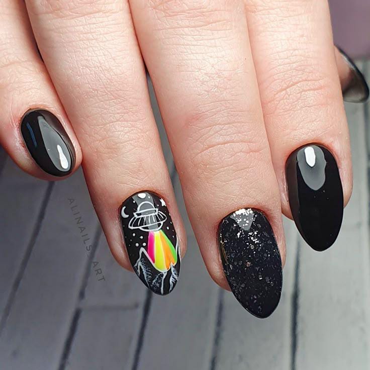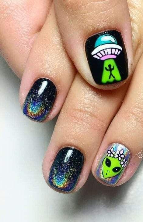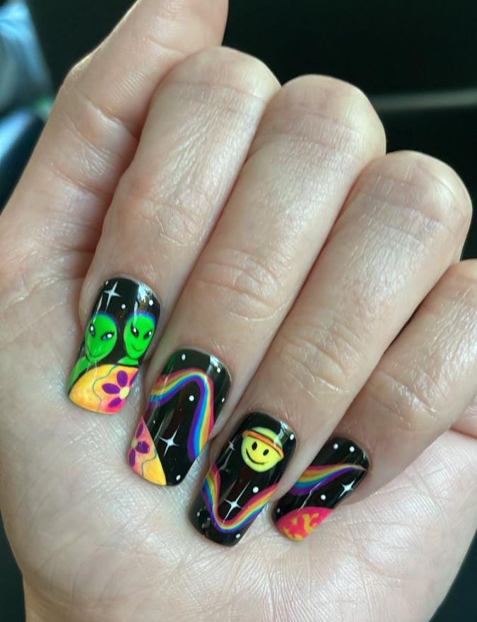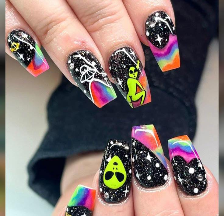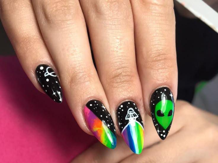 Black starry nails mixed with rainbow beams, UFO art, and a green alien face for a fun, spacey look.