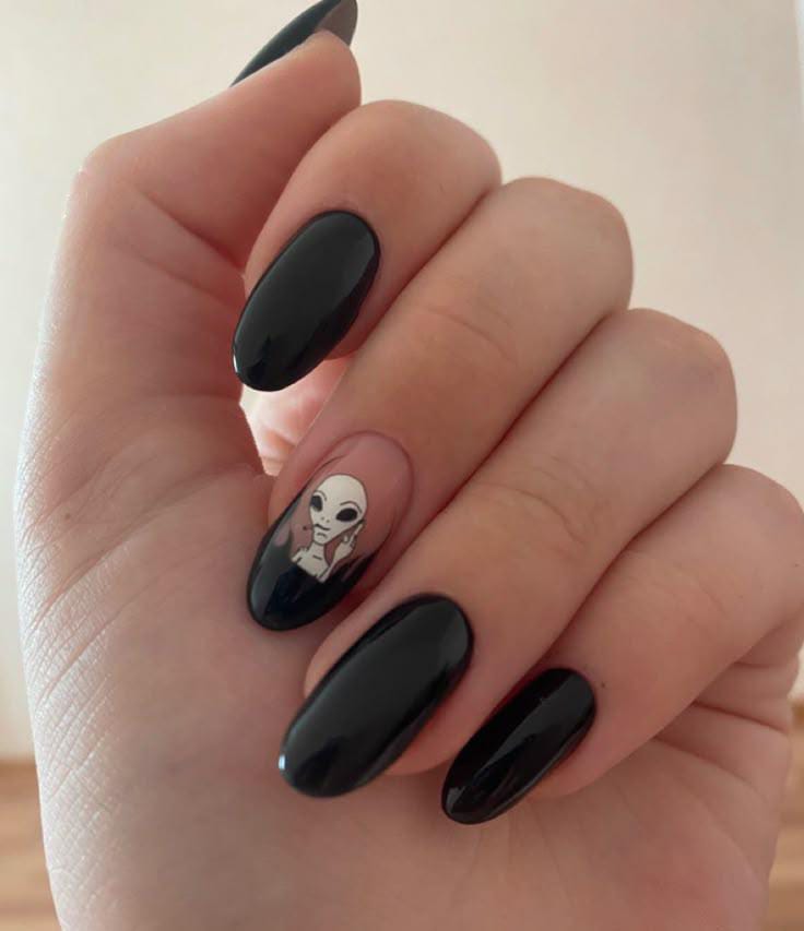 Glossy black nails contrasted with a single nude nail showcasing a subtle alien head design.