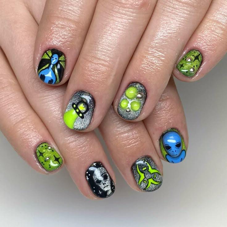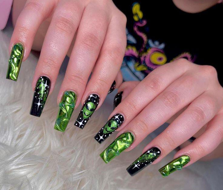 Edgy black, neon green, and metallic silver nails with alien heads, hypnotic swirls, and stars for a bold sci-fi look.