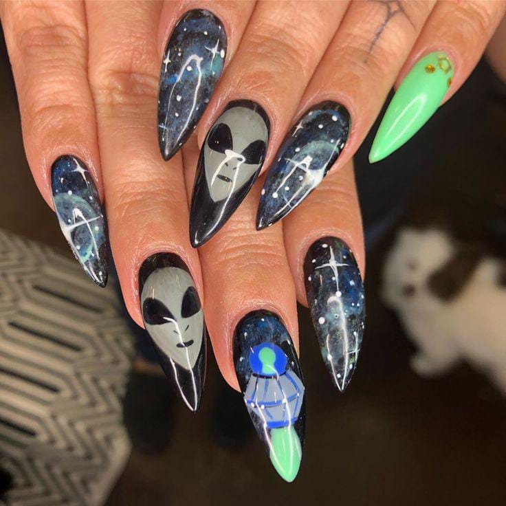 Sharp stiletto nails with dark galaxy skies, gray alien faces, and UFO accents for a mysterious cosmic feel.