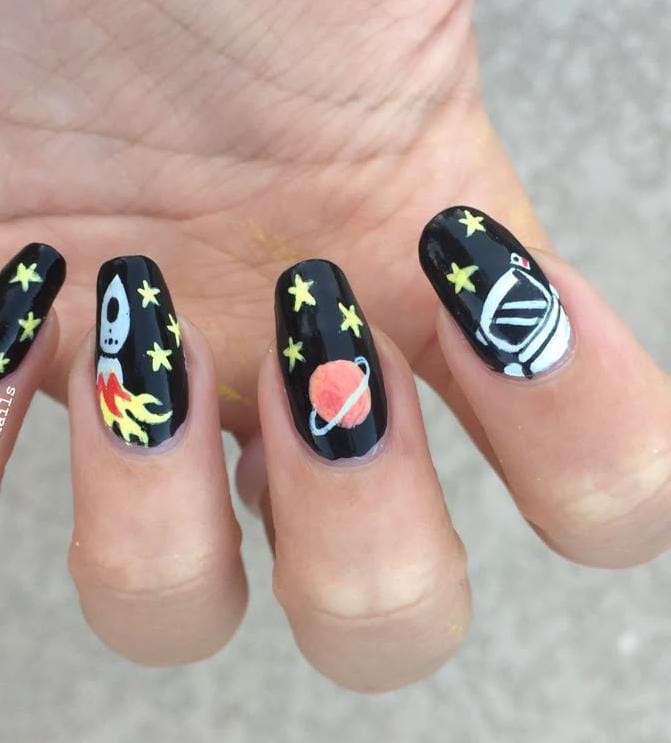 Fun black nails decorated with rockets, planets, and stars, giving off a lighthearted cartoon space theme.