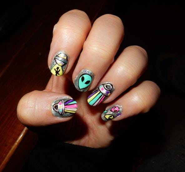 Colorful flying saucers, alien heads, and rainbow beams on silver-backed nails for a quirky, retro vibe.