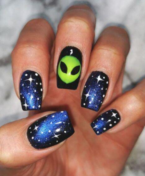 Deep blue galaxy nails with twinkling stars, featuring a bold neon-green alien accent for a cosmic vibe.