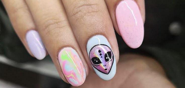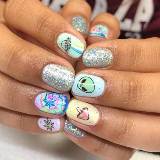 Short pastel and glitter nails featuring UFOs, aliens, and colorful cosmic accents for a dreamy, playful style.