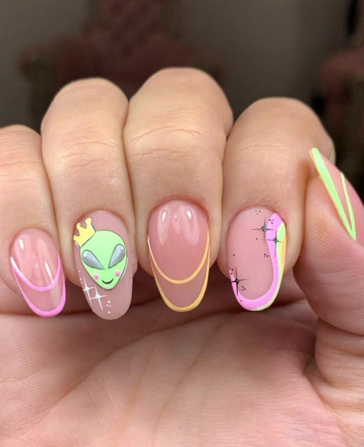 Nude base nails with a crowned alien accent and pastel line details, keeping it fun yet elegant.