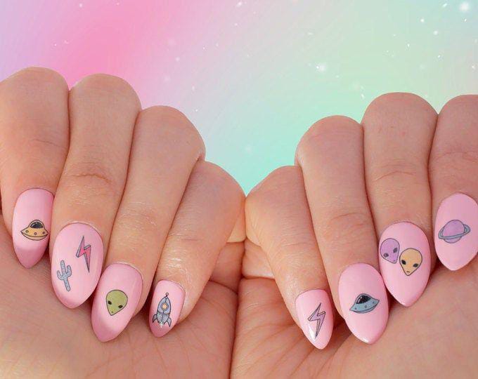 Soft pink nails decorated with playful alien, rocket, and UFO doodles for a cute, pastel sci-fi vibe.