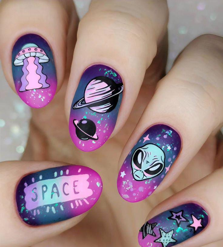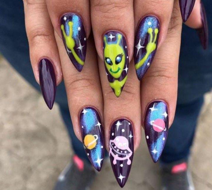 Bold purple nails with shimmering space backgrounds, planets, and a neon green alien for a dramatic outer-space look.