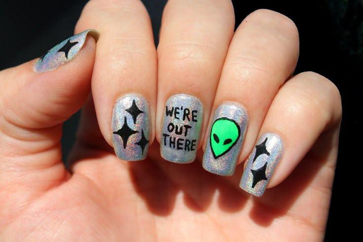 Silver holographic nails with black starbursts, a bright green alien face, and text for a fun, futuristic statement.