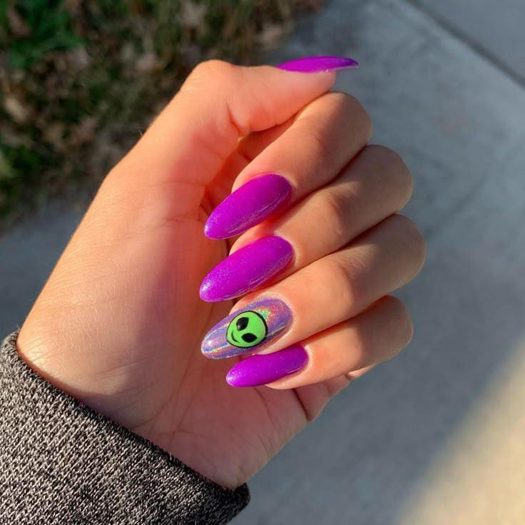 Vivid purple nails contrasted with a holographic accent nail featuring a glowing green alien for a fun pop of color.