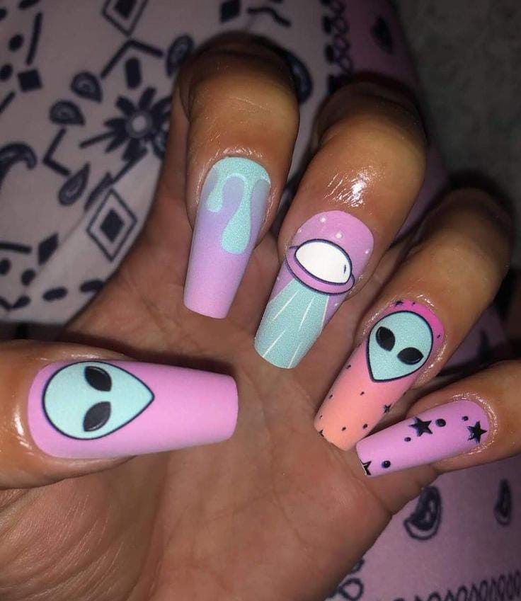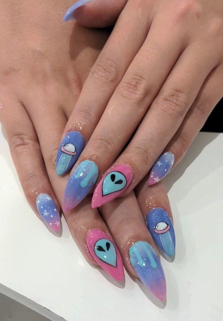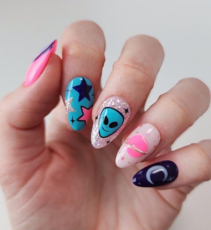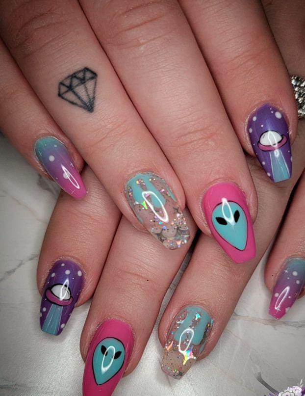 A playful mix of pink, teal, and purple nails with sparkly accents, featuring cute alien heads and tiny UFOs for a fun cosmic vibe.