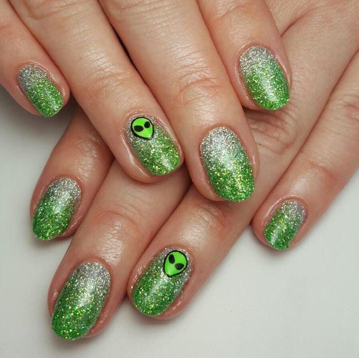 Sparkly green-to-silver ombré glitter nails with neon alien accents for a bold, spacey shimmer.