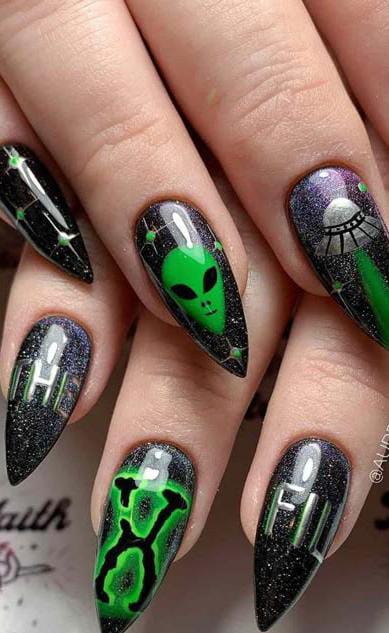 Dark, shimmering nails with neon green alien art, spaceships, and sci-fi patterns, perfect for a mysterious look.