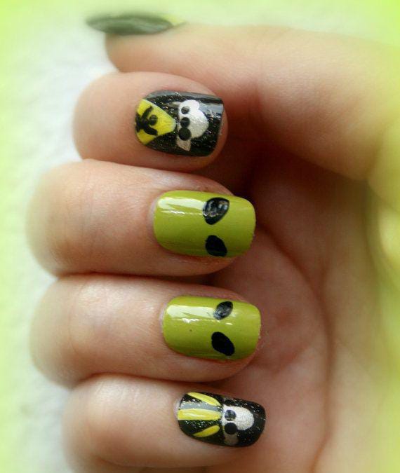 Bright green nails with simple black alien faces and a few UFO’s, giving off a retro extraterrestrial feel.