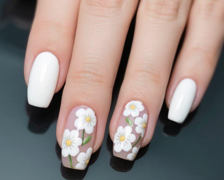 A sheer light pink gel base is decorated with tiny white daisy flowers that look soft and elegant. The floral details give the nails a fresh, natural springtime charm perfect for April.
