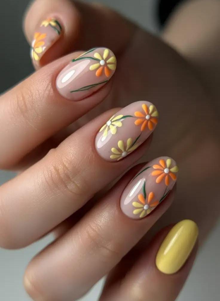 A glossy nude gel base is decorated with tiny yellow and orange daisies connected by thin green stems. The design feels light, playful, and perfect for an easy April springtime look.