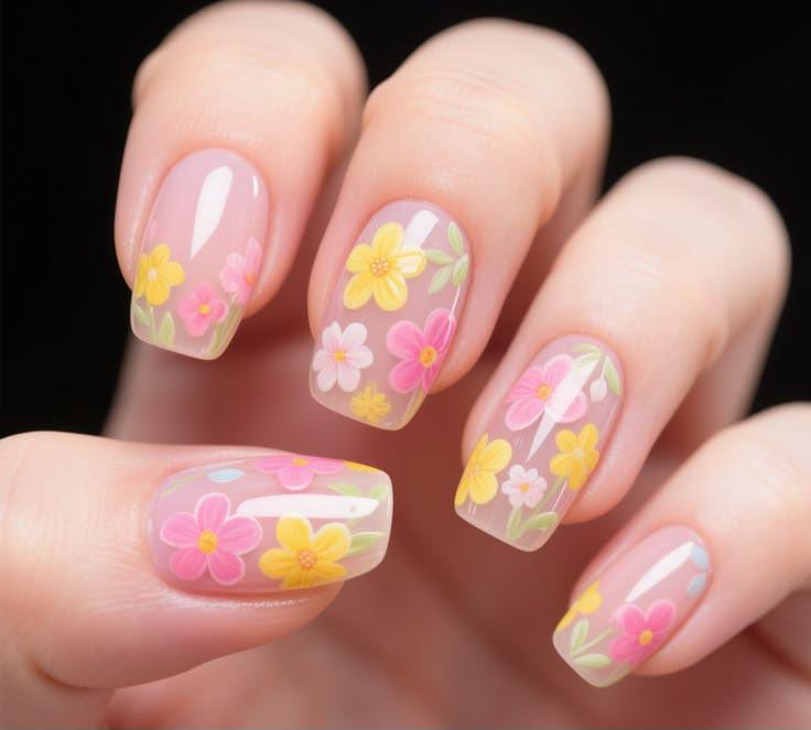 Soft sheer translucent gel nails are decorated with delicate pastel flowers in yellow, pink, and white, creating a light and fresh spring look. The design feels airy, playful, and perfect for an easy April manicure.