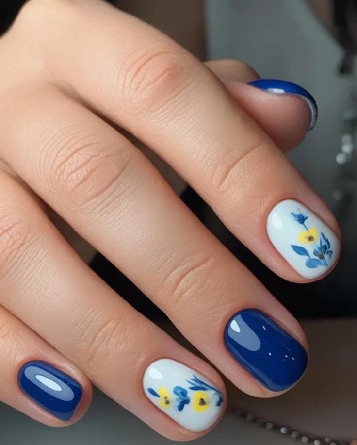 This design mixes deep glossy navy gel nails with soft white accent nails featuring tiny blue and yellow floral art. The contrast gives a clean, easy April spring vibe while still keeping a delicate floral touch.