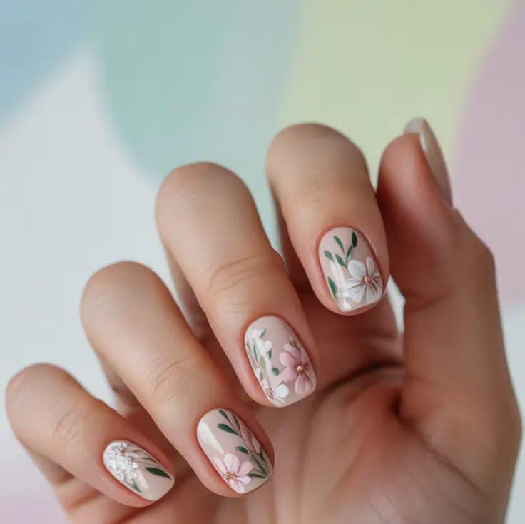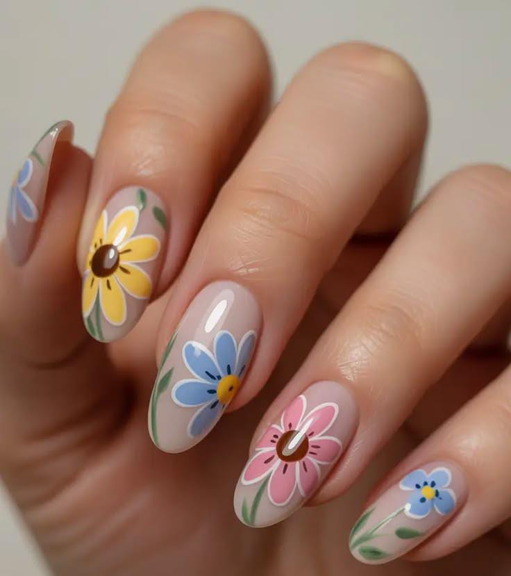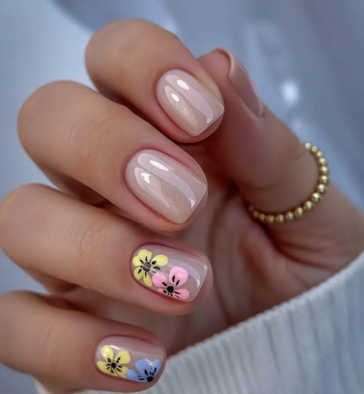 A nude gel base is decorated with delicate pastel flowers in blue, pink, and yellow with subtle green stems. The design looks soft and minimal, creating a calm and artistic April springtime feel.