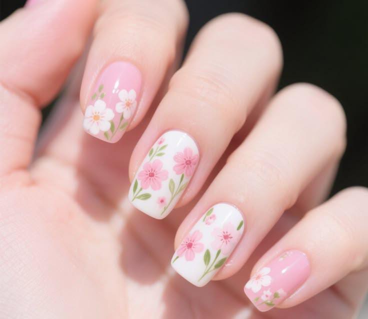 A mix of baby pink and white gel nails is decorated with delicate pink and white floral patterns and tiny green leaves. The overall look is sweet, feminine, and perfectly captures a gentle springtime vibe and perfect for April.