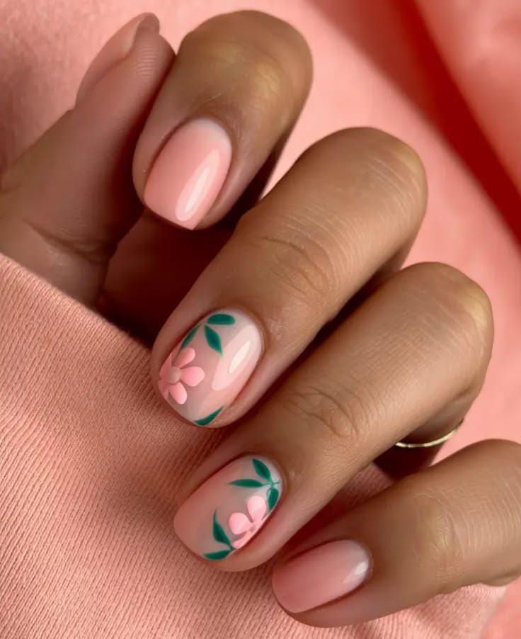 Soft pink gel nails create a warm and glossy base, with a couple of nails decorated with simple pink flowers and green leaves. The design feels calm, fresh, and beautifully suited for a soft April look.