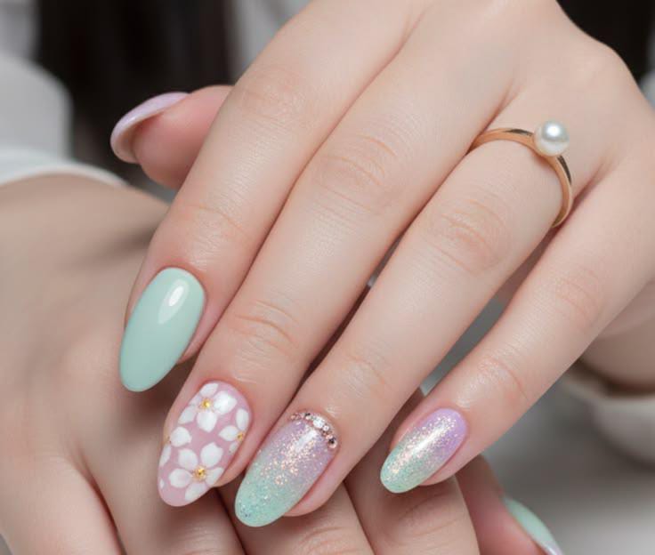 This design combines pastel mint gel ombre nails with glittery accents and delicate white floral, rhinestone details. The overall look is bright, easy, and gives a dreamy April springtime vibe.