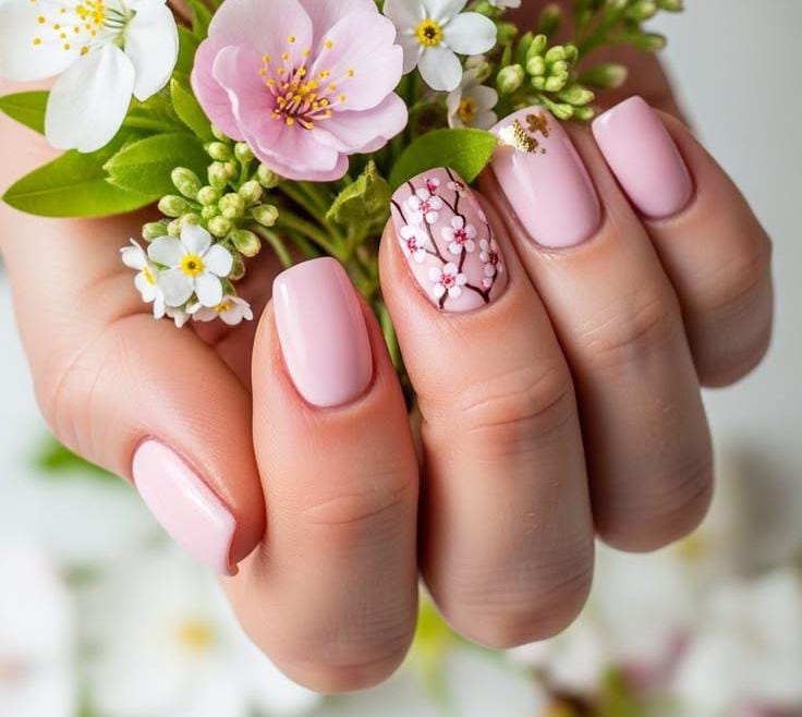 Soft pastel pink gel nails create a delicate and elegant spring look. One accent nail features tiny cherry blossom flowers, giving the design a fresh April garden vibe.