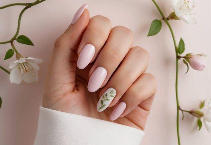 These soft blush pink gel nails feel clean, simple, and very classy. A single accent nail with small green leaves adds a subtle natural touch perfect for April spring.
