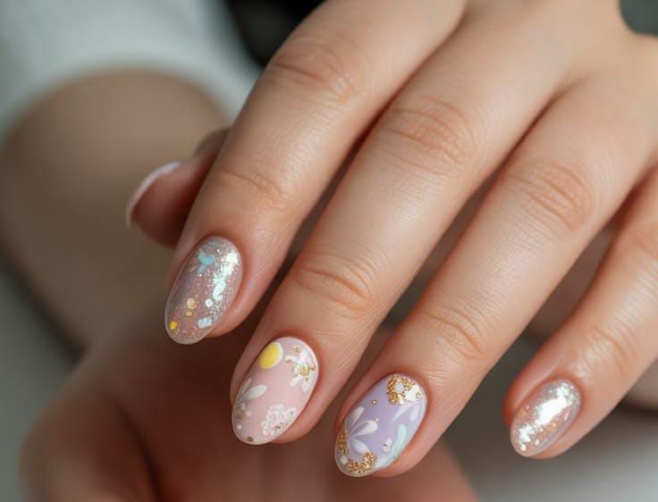 These soft nude gel nails feature delicate floral accents and subtle glitter details for a dreamy spring look. The mix of pastel tones and gold shimmer gives the design a light and elegant April vibe.