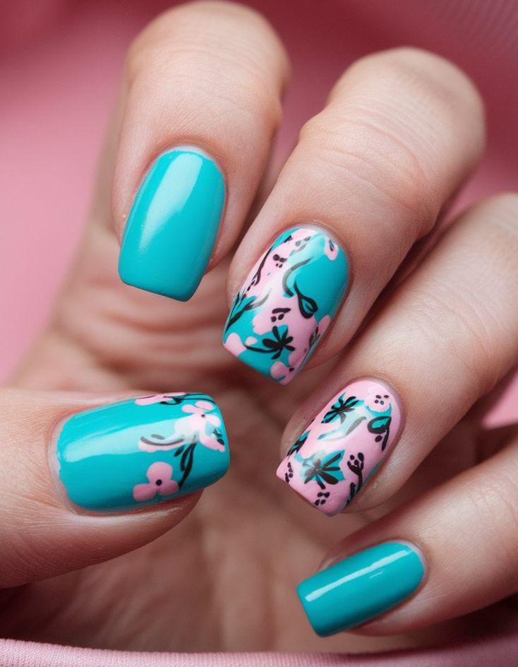 Bright turquoise gel nails are paired with accent nails featuring a soft pink base and delicate floral patterns. The mix of bold color and playful flowers creates a cheerful, vibrant April spring vibe.