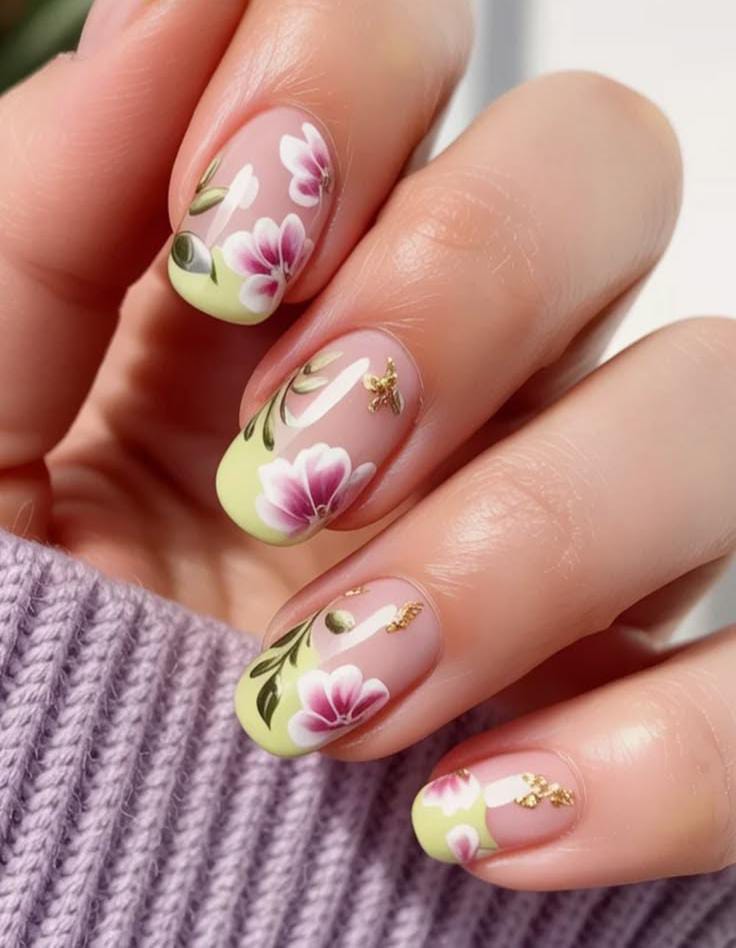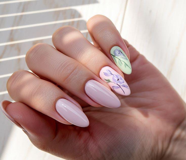 These glossy pastel gel nails combine soft pink with gentle green and purple floral art. The design feels fresh and airy, like a blooming April spring garden. 🌸