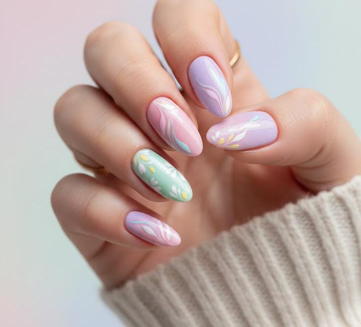 Soft pastel gel shades like lavender, mint, and blush create a gentle spring palette across the nails. Delicate swirl patterns add a playful and airy feel, giving the design a fresh easy April vibe.