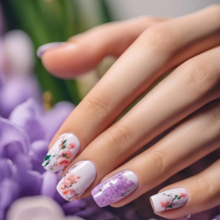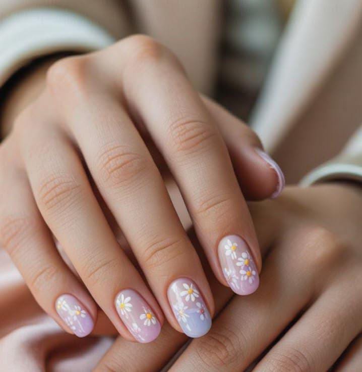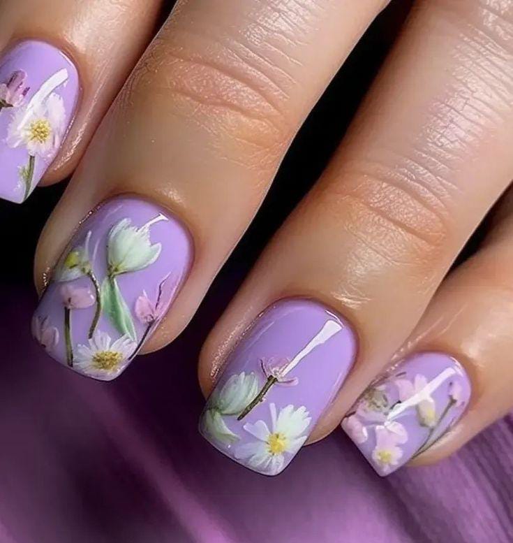 Soft lavender gel nails feature delicate white daisy flowers and light botanical details that create a dreamy spring look. The design feels fresh and gentle, capturing the calm beauty of blooming April gardens.