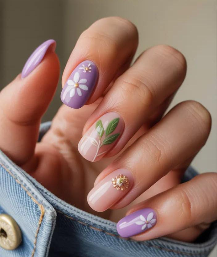 Soft lavender and nude gel nails are decorated with delicate flowers and leafy botanical accents. The mix of floral art and subtle 3D gold creates a fresh, elegant April spring garden vibe.