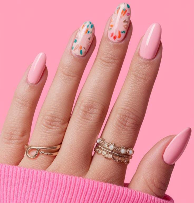 Glossy baby pink gel nails are paired with playful accent nails featuring colorful confetti-style dots and tiny shapes. The design feels bright, fun, and cheerful—perfect for a simple April look.
