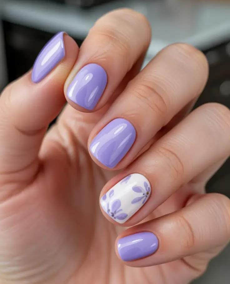 Glossy lavender gel nails create a clean and calming spring look. A white accent nail with delicate lavender leaf patterns adds a soft April botanical touch.