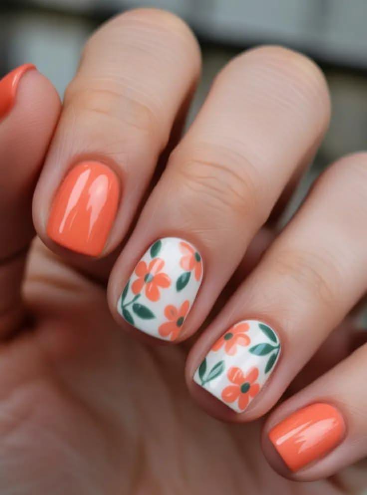 Bright orange gel nails bring a fresh and cheerful pop of color. Floral accent nails with orange flowers and green leaves give the design an easy April spring garden vibe.