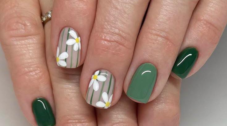 Soft green gel tones pair with delicate white daisies and strips to create a fresh, spring-inspired manicure. The mix of solid green nails and floral accents gives it an easy, cheerful April garden vibe.