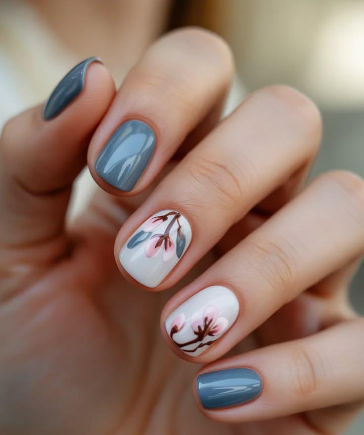 Muted blue gel nails paired with delicate floral accents create a calm and elegant spring look. The soft blossoms on a light base add a gentle, artistic touch perfect for April gel nails.