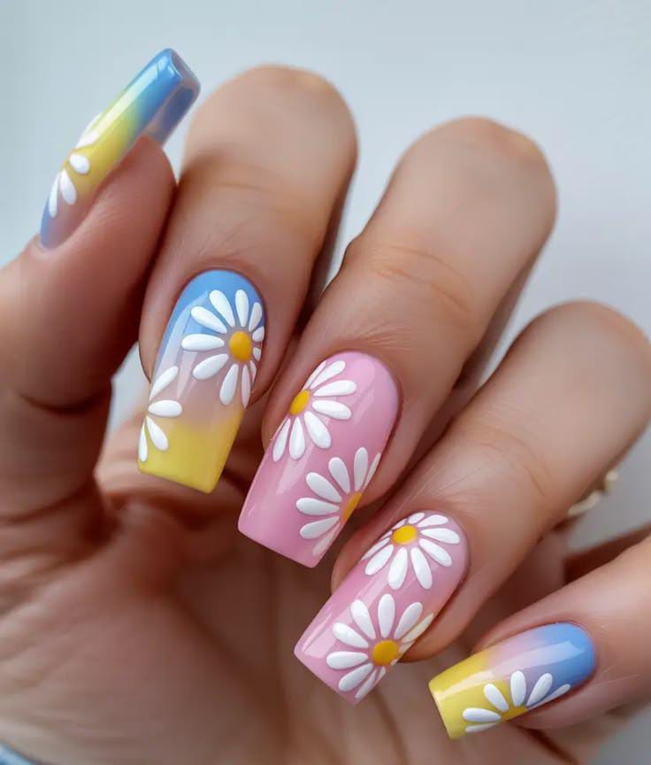 Soft pastel gel gradients of pink, blue, and yellow blend beautifully across the nails with white daisy flowers on top. The design feels bright, playful, and perfectly captures a cheerful April spring vibe.