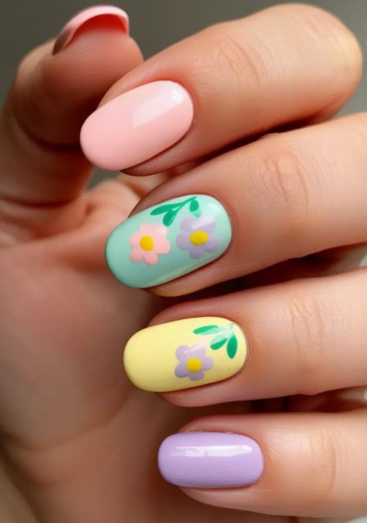 A mix of pastel gel shades like light blue, yellow, lavender, and blush creates a playful spring palette. Small colorful flowers give the design a cheerful, fresh, easy April garden vibe.