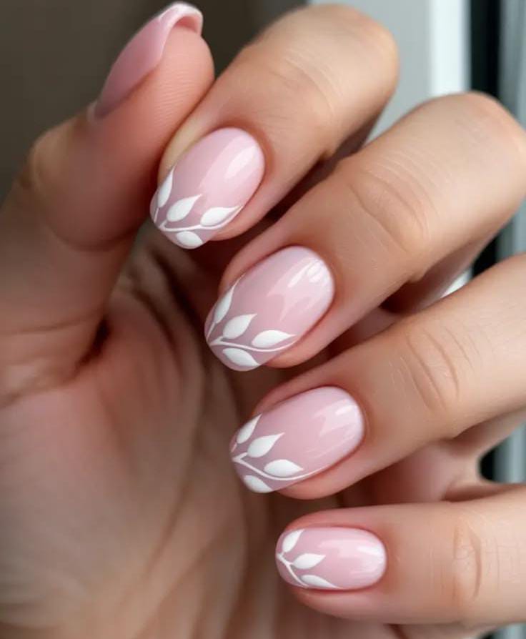 A soft blush pink gel base is paired with delicate white leaf accents along the tips, giving a modern twist to a French-style look. The design feels clean, minimal, and elegant with a gentle spring vibe perfect for April