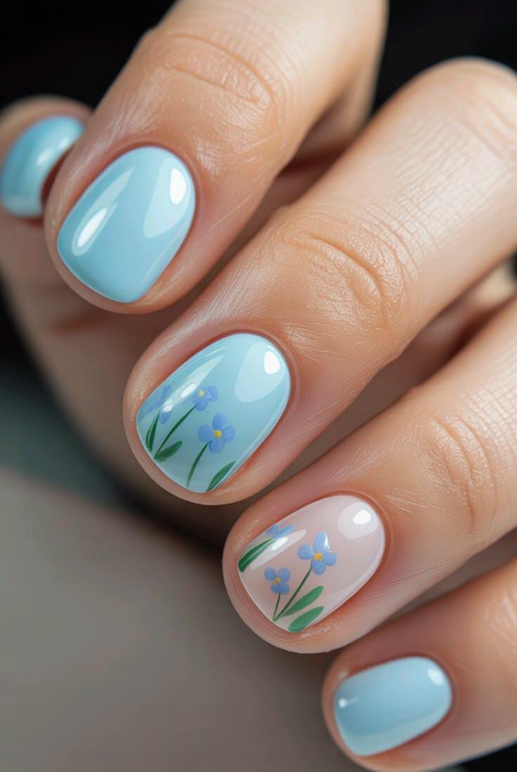 A glossy pastel blue gel base is combined with tiny hand-painted blue flowers and green stems for a fresh floral look. The design feels light, cheerful, and inspired by blooming spring gardens perfect for April.