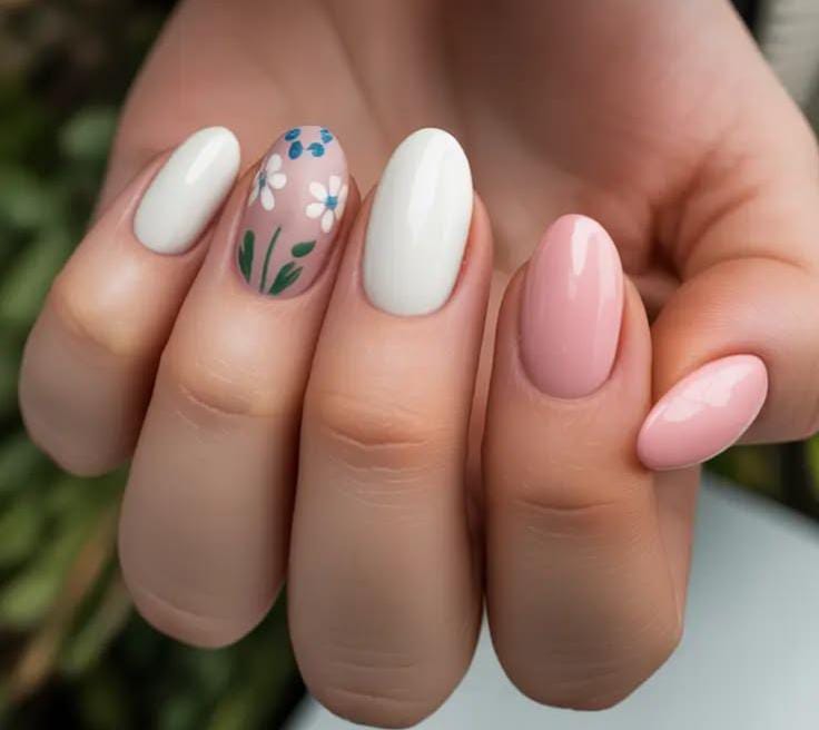 Soft pink and creamy white gel nails are paired with a delicate floral accent nail featuring tiny white and blue flowers with green leaves. The design feels fresh, gentle, and perfectly inspired by a blooming April garden.