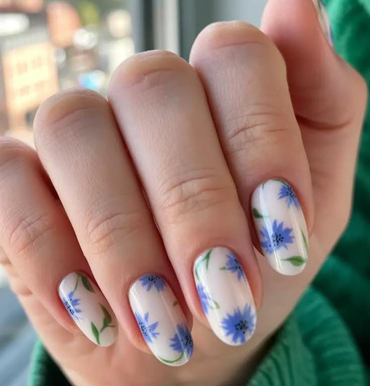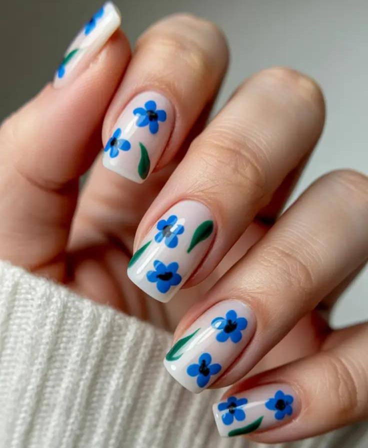 A clean milky gel base is decorated with simple blue flowers and small green leaves for a fresh, minimal spring look. The bright floral pattern gives the nails a soft yet lively April vibe. 🌼